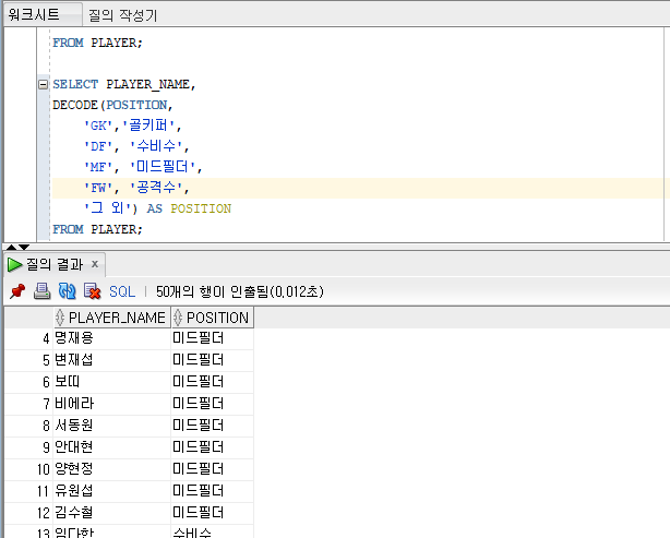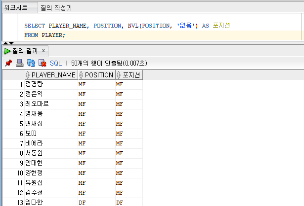 SELECT PLAYER_NAME, POSITION, NVL(POSITION, '없음') AS 포지션 FROM PLAYER;