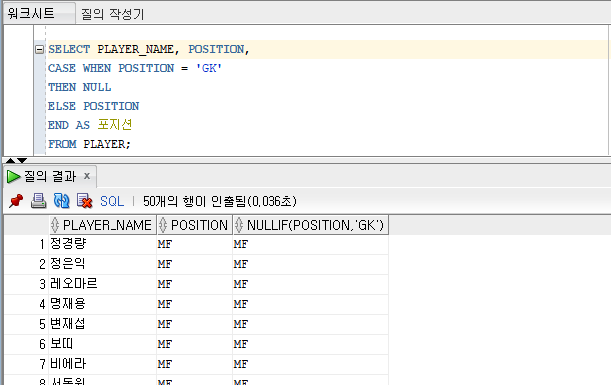 | NULLIF (표현식1, 표현식2) | 두 식이 같으면 NULL, 같지 않으면 표현식1의 값을 반환 SELECT PLAYER_NAME, POSITION, NULLIF(POSITION, 'GK') FROM PLAYER; "NULL을 반환해라 만약에 표현식1과 표현식2가 같으면!" |