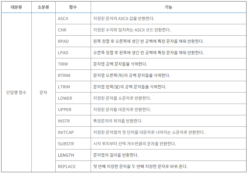 | 문자형 함수 | 함수 사용 예 |
