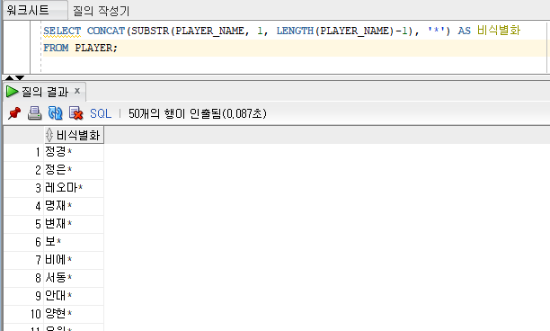 SELECT CONCAT(SUBSTR(PLAYER_NAME, 1, LENGTH(PLAYER_NAME)-1), ‘*’) AS 비식별화