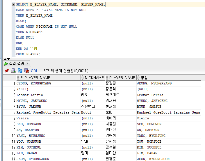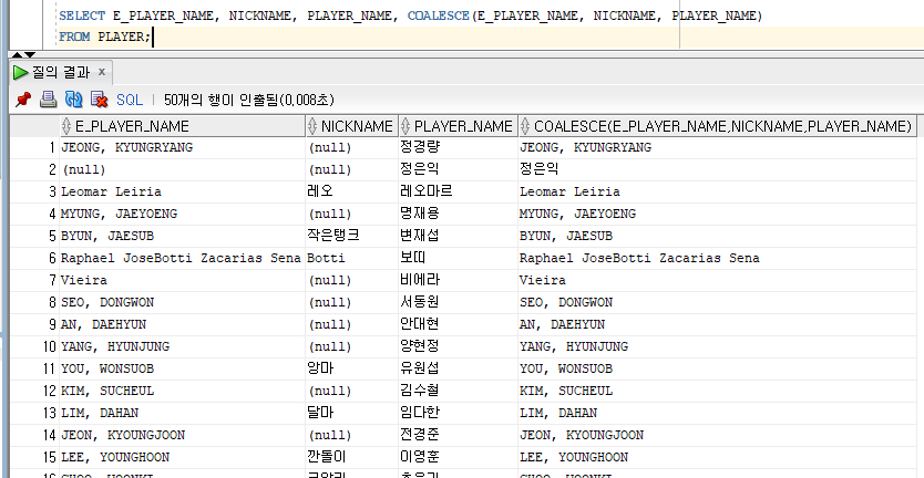 | COALESCE (표현식1, 표현식2) | "우선순위가 정해져있음" 임의의 개수의 표현식에서 NULL이 아닌 최초의 표현식을 반환 모든 표현식이 NULL이라면 NULL을 반환 SELECT E_PLAYER_NAME, NICKNAME, PLAYER_NAME, COALESCE(E_PLAYER_NAME, NICKNAME, PLAYER_NAME) FROM PLAYER; |