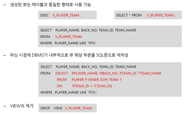 독립성 : 테이블 구조가 변경시, 뷰만 변경되고 뷰를 사용하는 응용 프로그램은 변경될 필요가 없음.