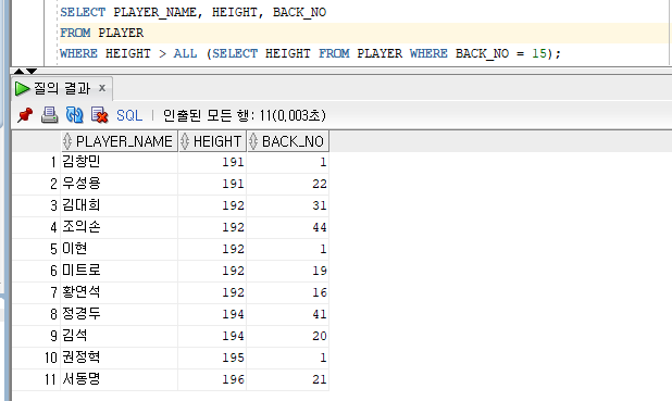 비교연산자 ALL(서브쿼리) : 결과의 모든 값을 만족해야 하는 조건