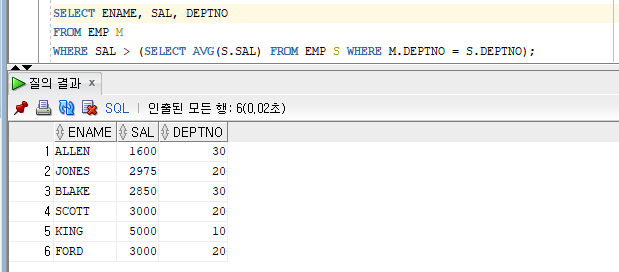 WHERE SAL > (SELECT AVG(S.SAL) FROM EMP S WHERE M.DEPTNO = S.DEPTNO);