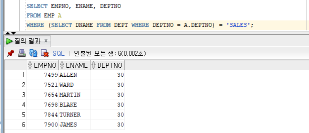 WHERE (SELECT DNAME FROM DEPT WHERE DEPTNO = A.DEPTNO) = 'SALES';