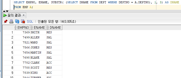 SELECT EMPNO, ENAME, SUBSTR( (SELECT DNAME FROM DEPT WHERE DEPTNO = A.DEPTNO), 1, 3) AS DNAME FROM EMP A;