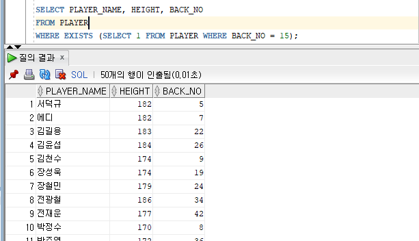 WHERE EXISTS (SELECT 1 FROM PLAYER WHERE BACK_NO = 15);