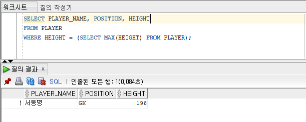 예) 신장이 가장 큰 선수의 정보 조회