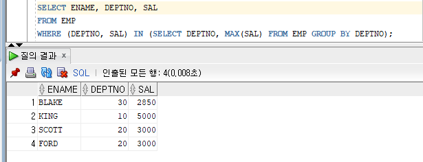 WHERE (DEPTNO, SAL) IN (SELECT DEPTNO, MAX(SAL) FROM EMP GROUP BY DEPTNO);
