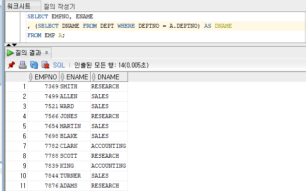 , (SELECT DNAME FROM DEPT WHERE DEPTNO = A.DEPTNO) AS DNAME