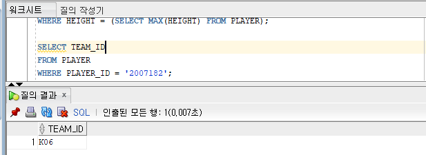 예) '2007182'번 선수와 같은 팀에 속하는 선수의 이름, 포지션, 팀ID 출력