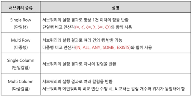 결과 칼럼/행의 수 : 단일행 서브쿼리 / 다중행서브쿼리