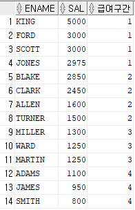 SELECT ENAME, SAL, NTILE(4) OVER (ORDER BY SAL DESC) AS 급여구간