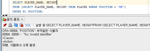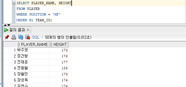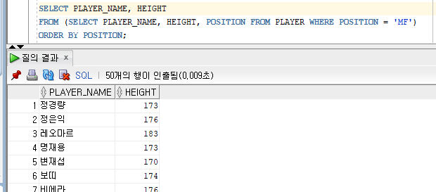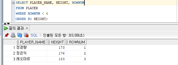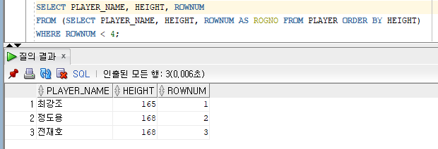 FROM (SELECT PLAYER_NAME, HEIGHT, ROWNUM AS ROGNO FROM PLAYER ORDER BY HEIGHT)