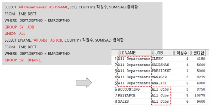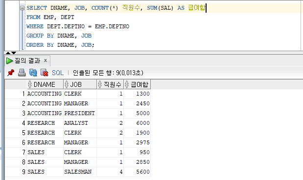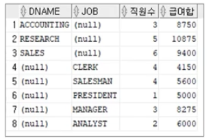 SELECT DNAME, JOB, COUNT(*) 직원수, SUM(SAL) AS 급여합