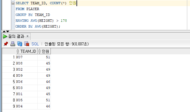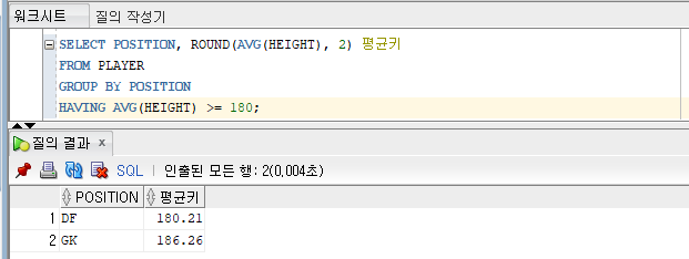 SELECT POSITION, COUNT(*) 전체행수, COUNT(HEIGHT) 키건수, ROUND(AVG(HEIGHT), 2) 평균키
