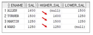 SELECT ENAME, SAL, LAG(SAL) OVER (PARTITION BY JOB ORDER BY SAL DESC) AS HIGHER_SAL, LEAD(SAL) OVER (PARTITION BY JOB ORDER BY SAL DESC) AS LOWER_SAL