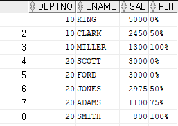 SELECT DEPTNO, ENAME, SAL, 100*(PERCENT_RANK() OVER (PARTITION BY DEPTNO ORDER BY SAL DESC)) || '%' AS P_R