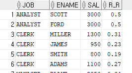 SELECT JOB, ENAME, SAL, ROUND(RATIO_TO_REPORT(SAL) OVER (PARTITION BY JOB), 2) AS R_R