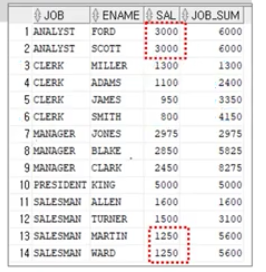 SELECT JOB, ENAME, SAL, SUM(SAL) OVER (PARTITION BY JOB ORDER BY SAL ASC ROWS BETWEEN 1 PRECEDING AND 1 FOLLOWING) AS JOB_SUM