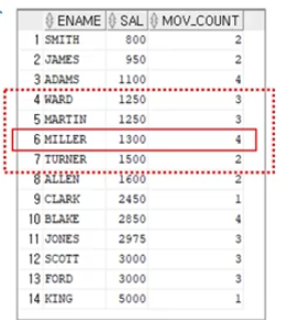 SELECT ENAME, SALM COUNT(*) OVER (ORDER BY SAL RANGE BETWEEN 100 PRECEDING AND 200 FOLLOWING) AS MOV_COUNT