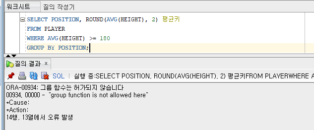 예) 포지션별 키의 평균이 180 이상인 경우만 출력